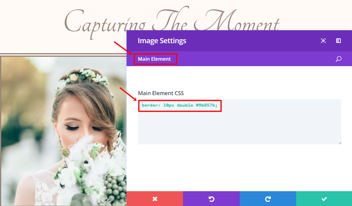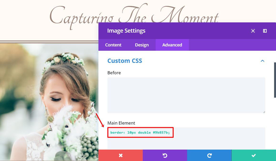 Add an Image Module to the first column of the row. Upload an image of the bride in the Content tab under the Image subcategory and move on to the Advanced tab. Click on the Custom CSS subcategory and add the following code line to the Main Element field: