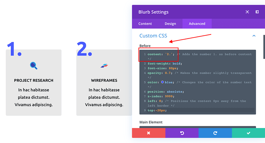Once you have added this code snippet you’ll see the number appear to the top left of the blurb module. You can amend the number’s position by altering the “left:” and “top:” lines or change the color and font size of the number within this CSS snippet.