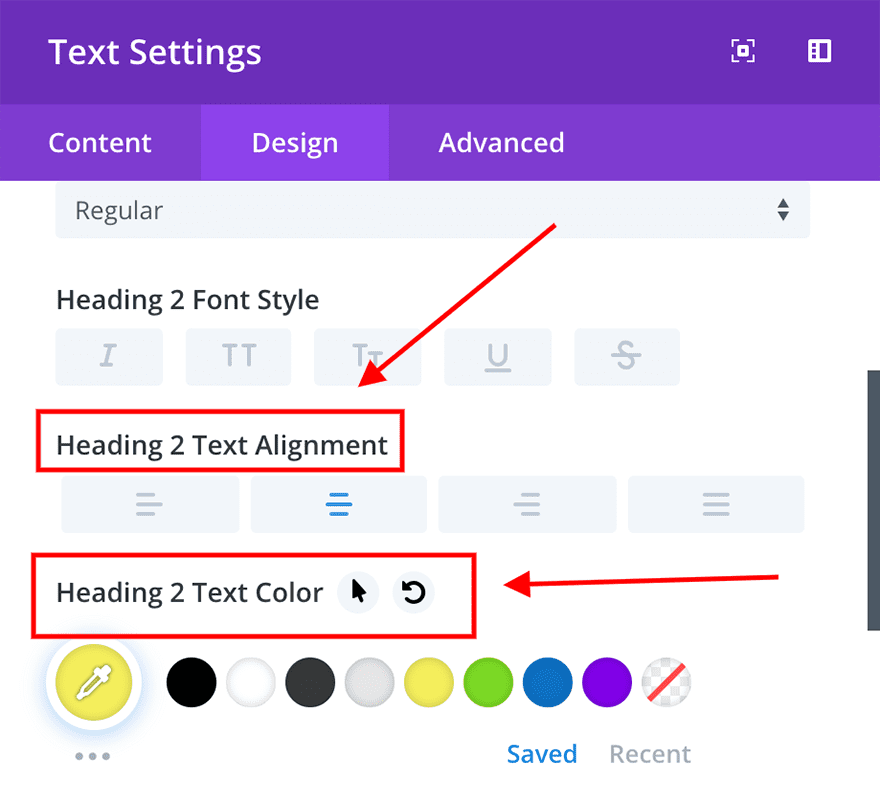 3. Heading Alignment: center & Heading color: #f5ee5d
