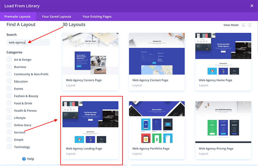 When your page loads you’ll have an option to use a premade layout, one of your saved layouts or build from scratch. Select premade layout and use the search bar to find “Web Agency” Layouts. The blurb section in this tutorial can be found on the Landing Page.