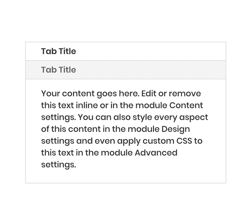 First of all we need to add our standard section and a 1 column row, followed by the Divi tabs module itself. Within the tabs module, we only need to add our titles and content to each tab as we’ll be handling the styles in the next steps.