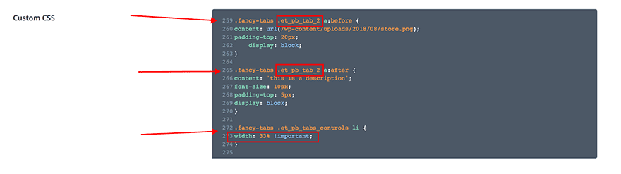 As you can see from the snippet, Divi automatically assigns a class to each tab title – the first starting with 0 (.et_pb_tab_0), increasing by 1 each time (.et_pb_tab_1, .et_pb_tab_2 and so on). We’ve already taken care of the first two tabs, so when adding more we can simply copy and paste a section of the code for every new tab: