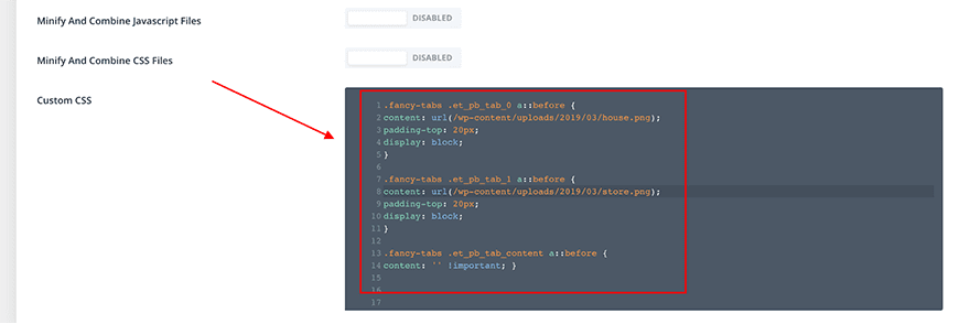 The following snippet will add the images above each tab title. Simply copy and paste this snippet into the custom CSS box and replace the content between (and including) the asterisks (e.g. *Replace this with the URL for your first image*) with the URLs you noted earlier.