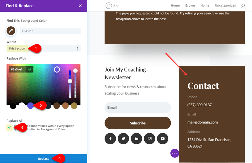 Now skip the second section (it can keep the brown color scheme) and go to the third section. Find the button at the bottom of the section with the title “Still Not Sure? Get In Touch”. Open the button settings, right click on the button background color, and select “Find & Replace”.