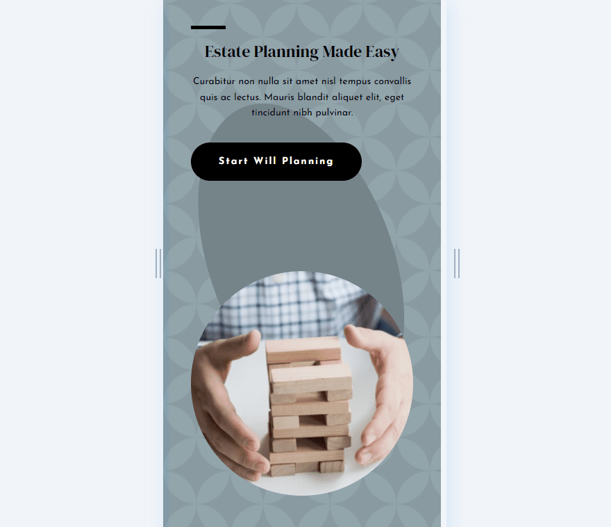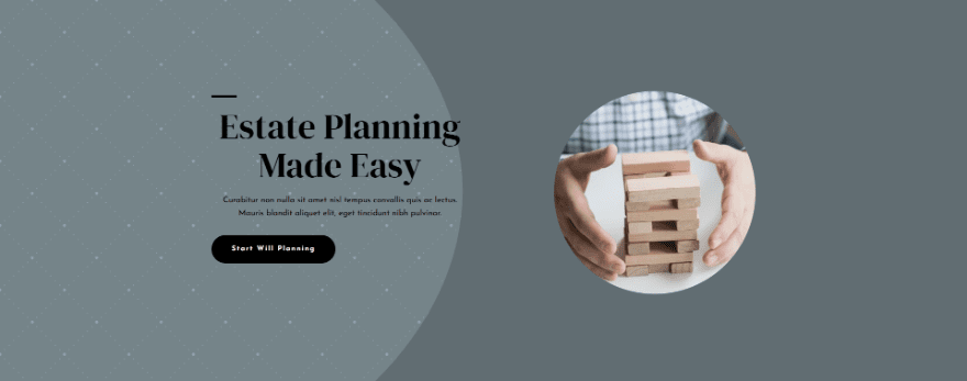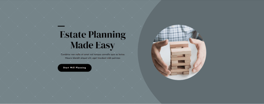For my examples, I’m using a modified version of the hero section from the Estate Planning landing page that’s available within Divi. Here’s a look at my section. The modification simplifies the hero section for our needs. It uses the Background Color Background: #92a5ab.