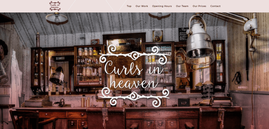 Curls in Heaven is a one-page layout designed for hair dressers and beauty salons. It displays the logo over a full-screen background with appointment CTA (call to action). The menu shows a styled pattern background that continues throughout the page. Work is shown through an image montage with border shadow effects. Hours are shown within an overlay. The team is shown with images and overlapping text. Pricing is displayed in overlays and use hover effects. The contact form also uses shadow effects for the border. This layout makes great use of color.