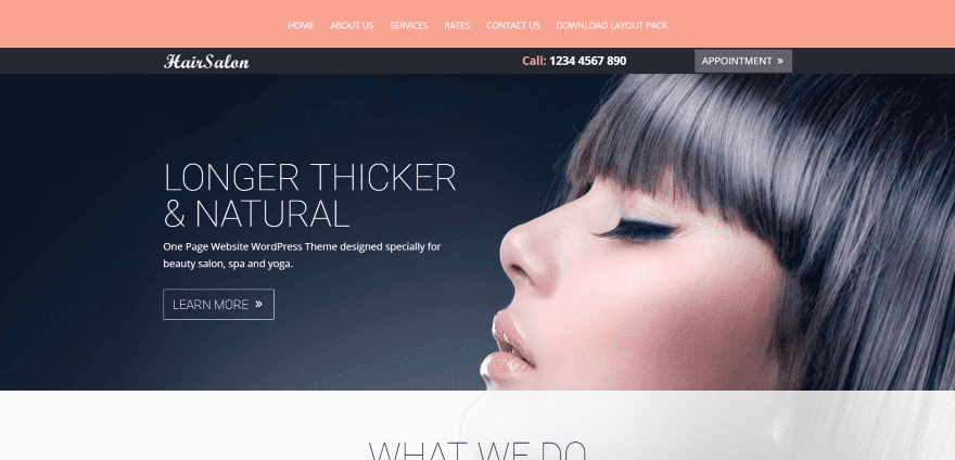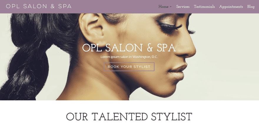 OPL Salon was designed for salons and spas. It comes with five pages including a home (which can be used as a one-page website if you want), services, testimonials, appointments, and blog. The team members are highlighted with photos with text and a button in an overlay. Services are shown within an alternating grid of images and text using true parallax. The pages use full-width or full-screen images with page titles in overlays. The appointments page uses a map rather than an image. The layout makes great use of large fonts for headings and matching colors throughout.