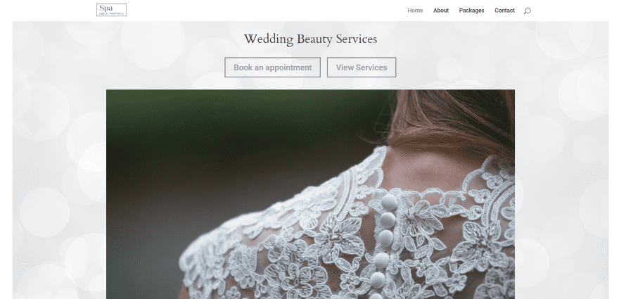 Spa Single Page Layout for Divi was designed for beauty spas with a specific focus on bridal beauty. The layout places a heading with two CTA’s above the image. The next section displays two columns with an image and text with CTA. Packages are shown within blurbs over a parallax background. Services are shown as images, descriptions, and include a button. Contact information and a styled contact form are placed over a background image in parallax.