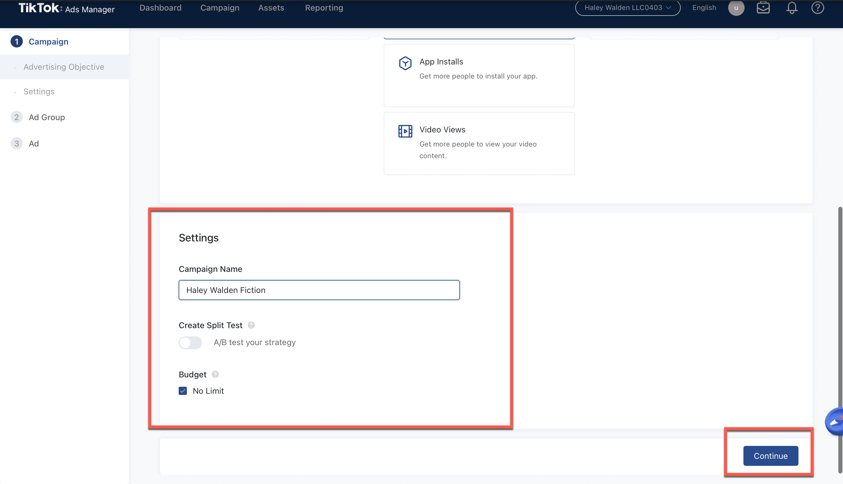 Once you’ve named your campaign, you can choose whether you want to create a split test for your ad. You can also decide whether you’d like to limit the available budget for your ad spend. Click Continue to move on to the next step.