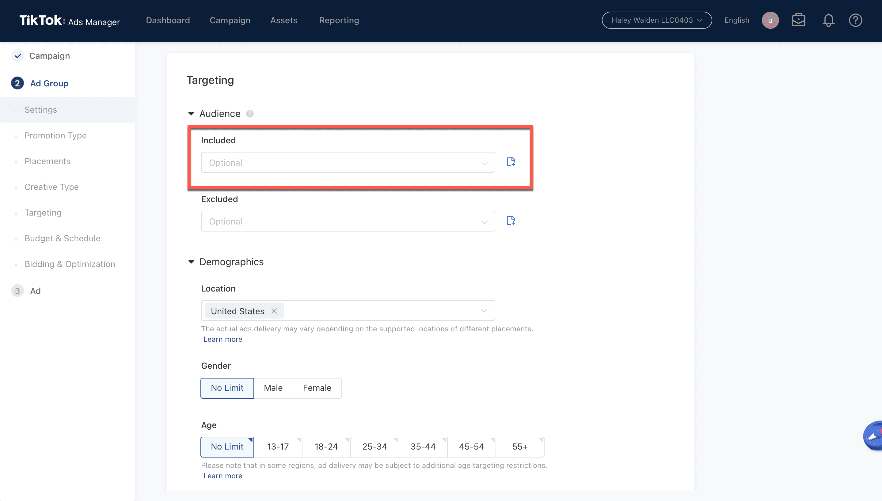 14. Now it’s time to target your audience. You can choose which individuals you might like to include or exclude from seeing your ad, their location, gender, and age range.