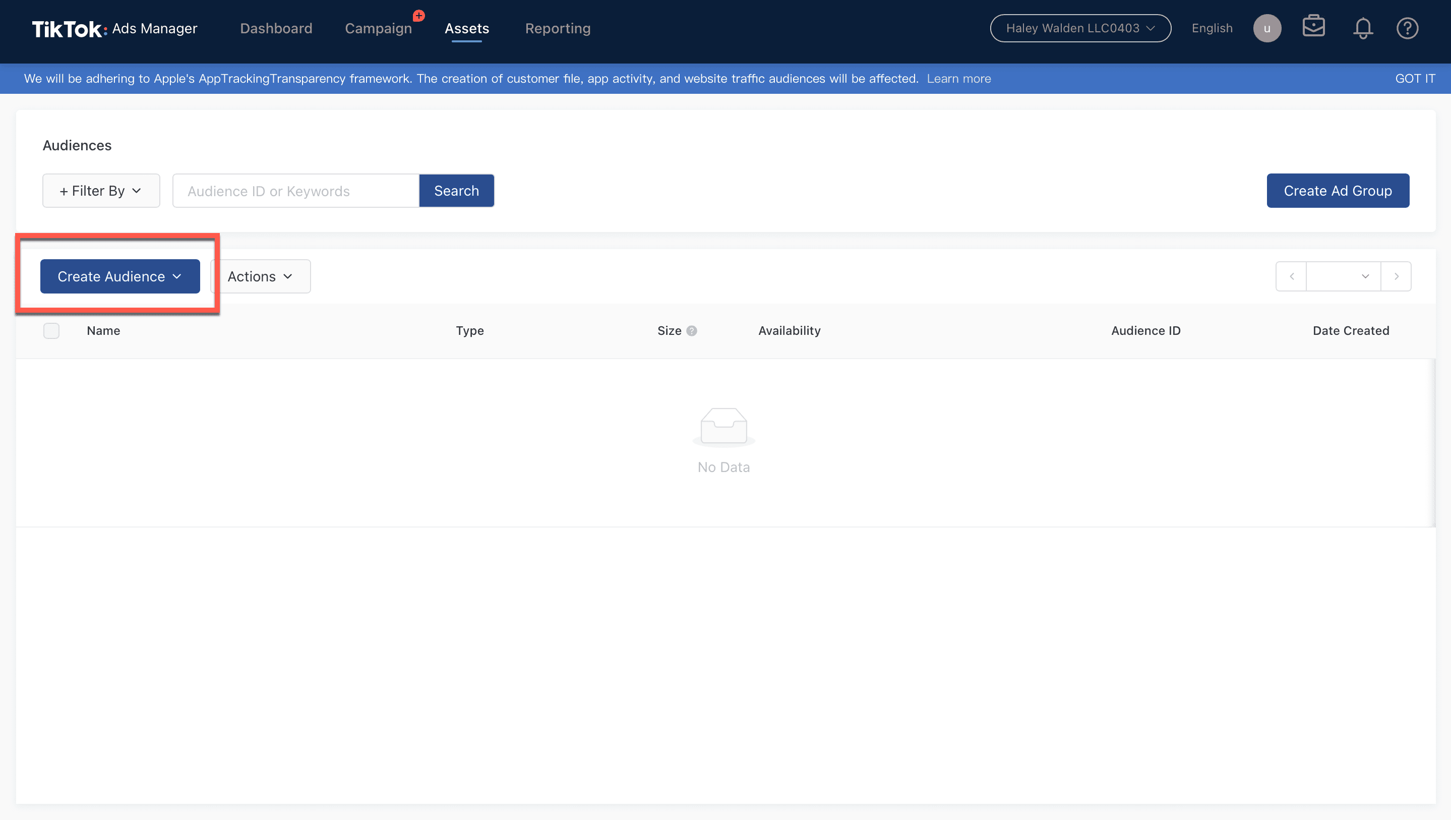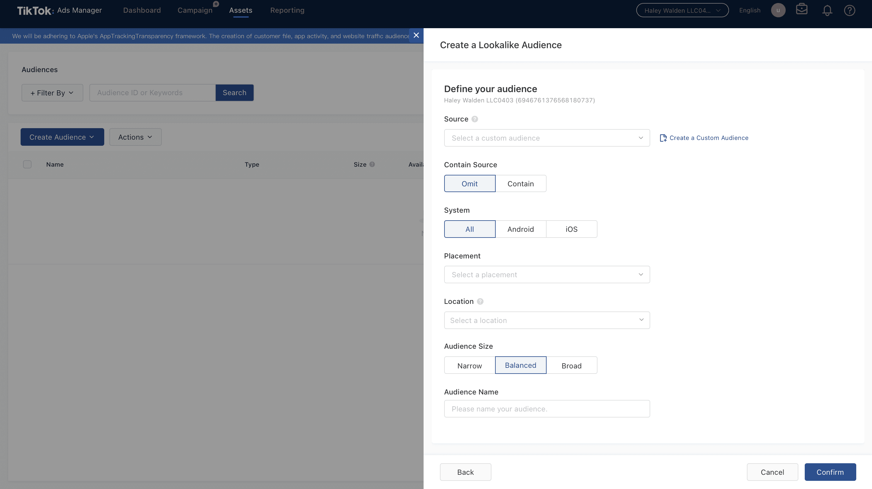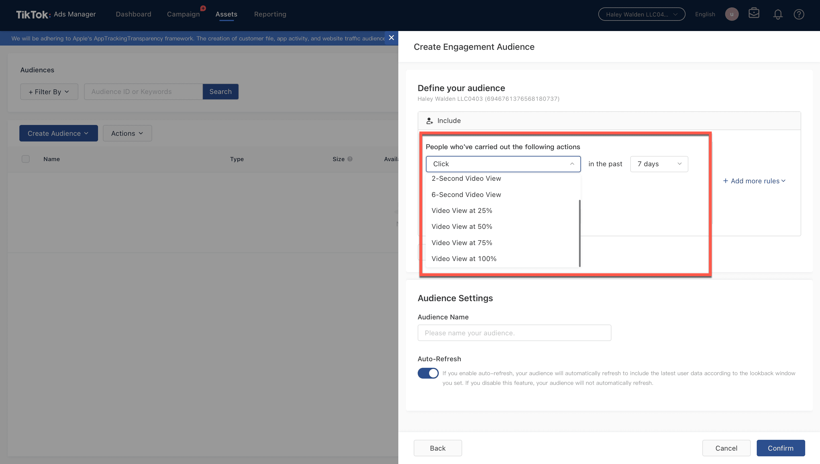 15. If you haven’t already created an audience that you can include, then TikTok Ads Manager will take you to a separate window where you can create your audience.