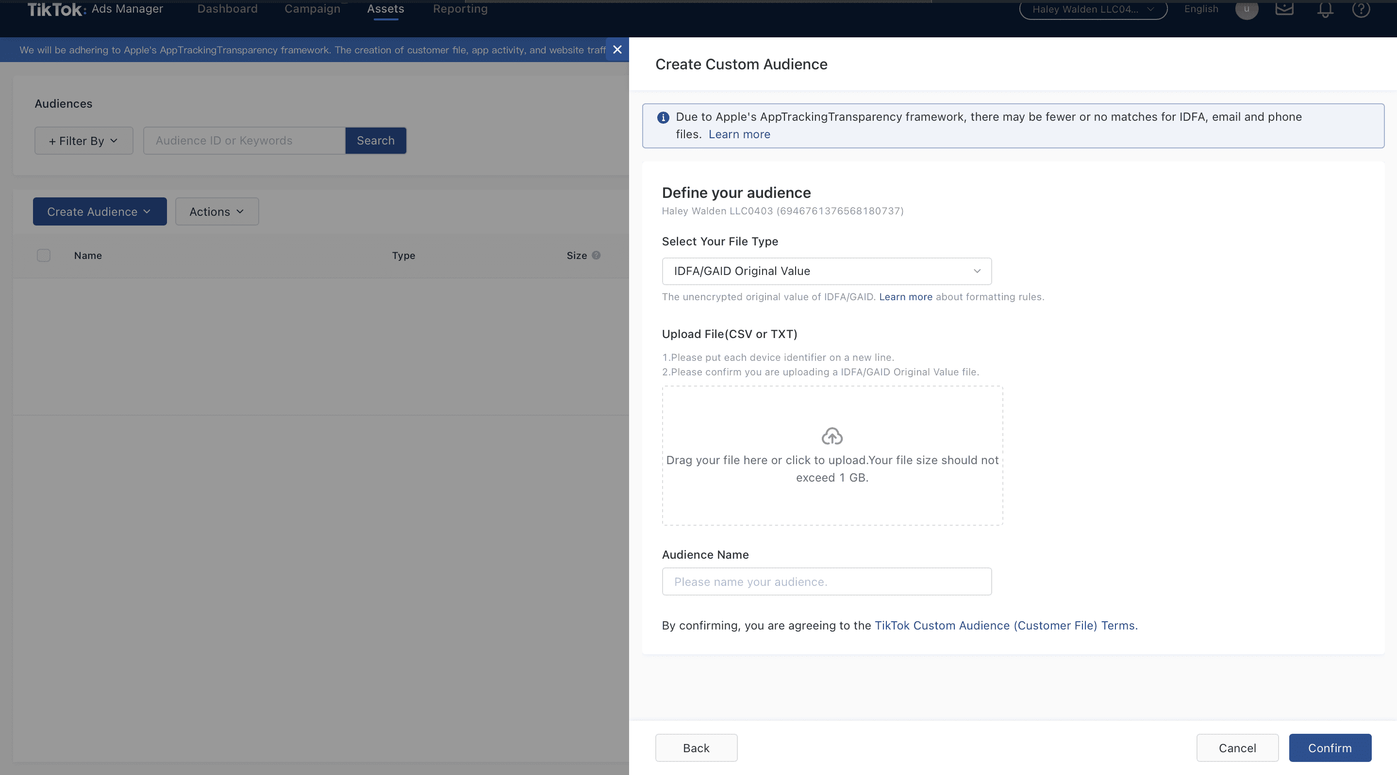 - Choose to upload a customer file, which can help the Tik Tok ads manager to match an audience on their own platform
