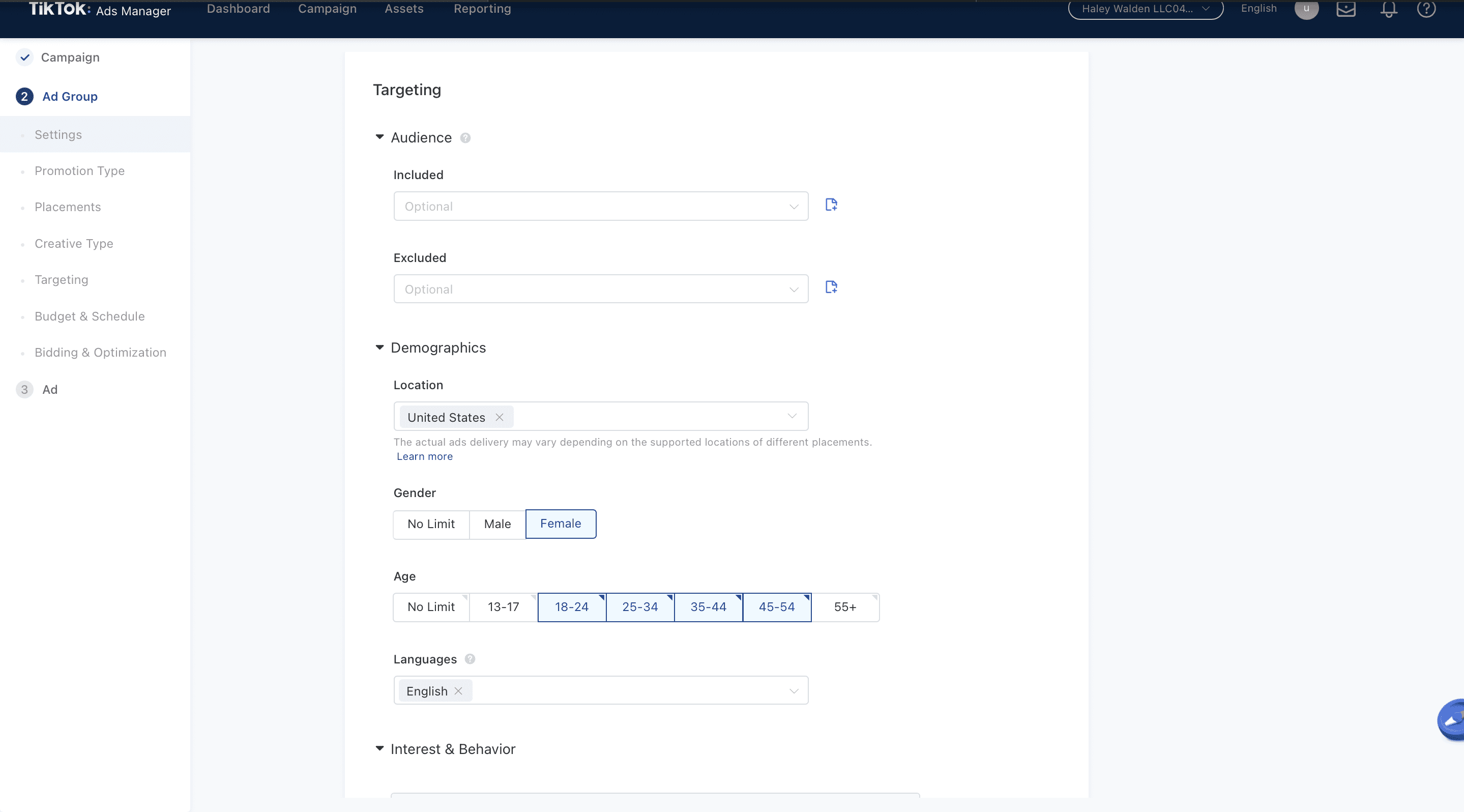 17. Now, it’s time to fill out the rest of your demographic information. In addition to basic demographics, such as age and location, you’ll also have the option to filter by behavior. For example, you can select a category of interest, such as Entertainment, then filter by viewers who watched your video in full, then engaged with it.
