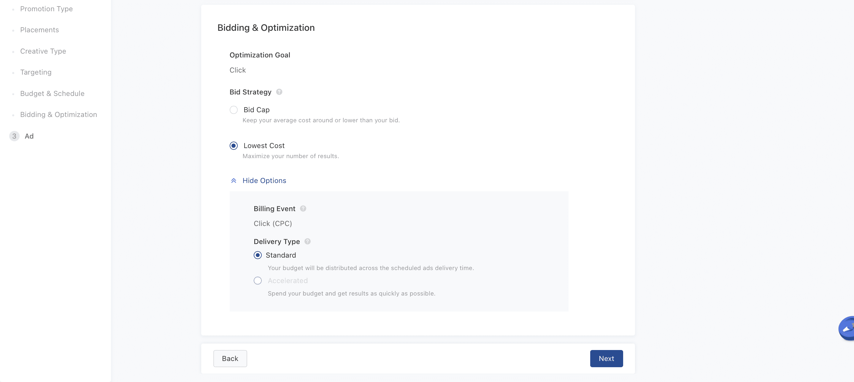 19. The next thing you’ll need to do is setting up bidding on your ad. You can either cap your bid, or have TikTok automatically keep the cost down. Billing is measured at cost per click (CPC). Click Next when you’re ready.