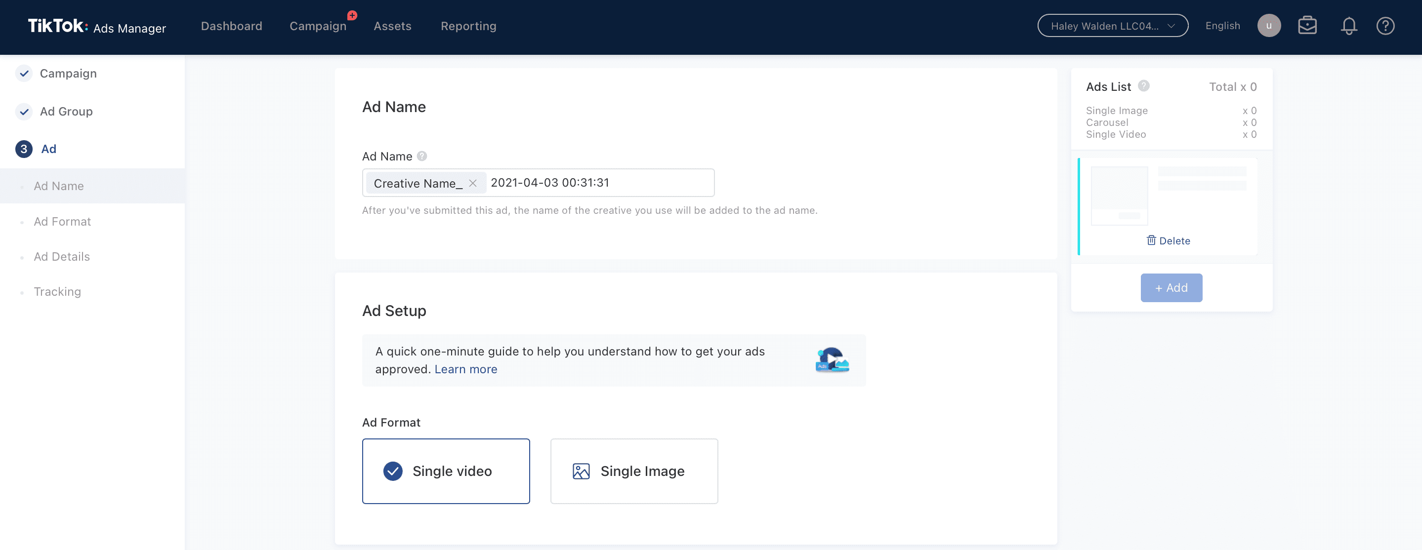 20. Now, it’s time to set up and format your ad. TikTok Ads Manager will take you through a series of steps to enter all the details on the ad campaign. First, name your ad, then decide whether you’ll be using a single video or single image.