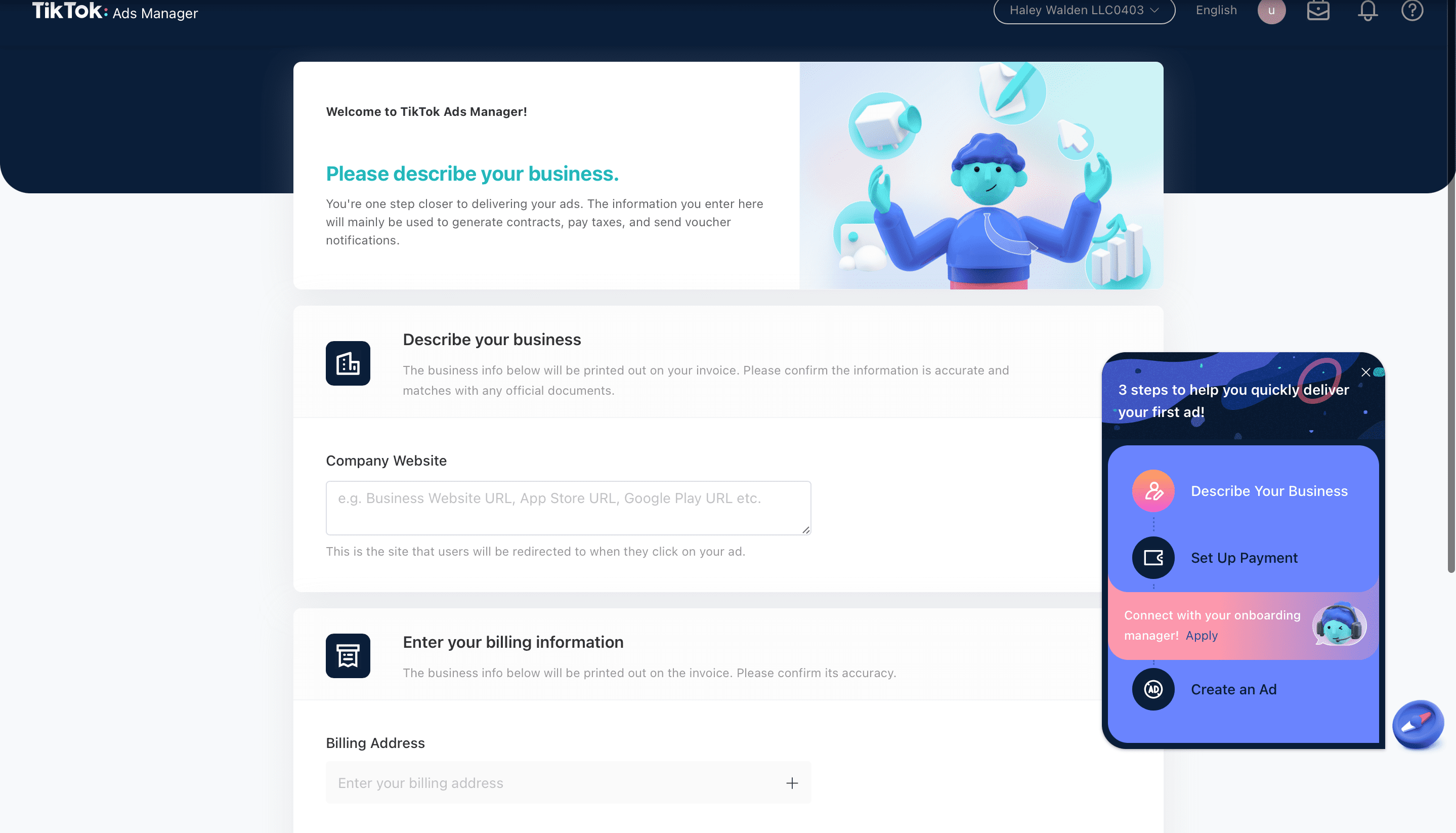 4. Next, you will be asked to describe your business inside TikTok’s Ad Manager. First, describe your business by adding the URL to your business website. Next, enter your billing information.