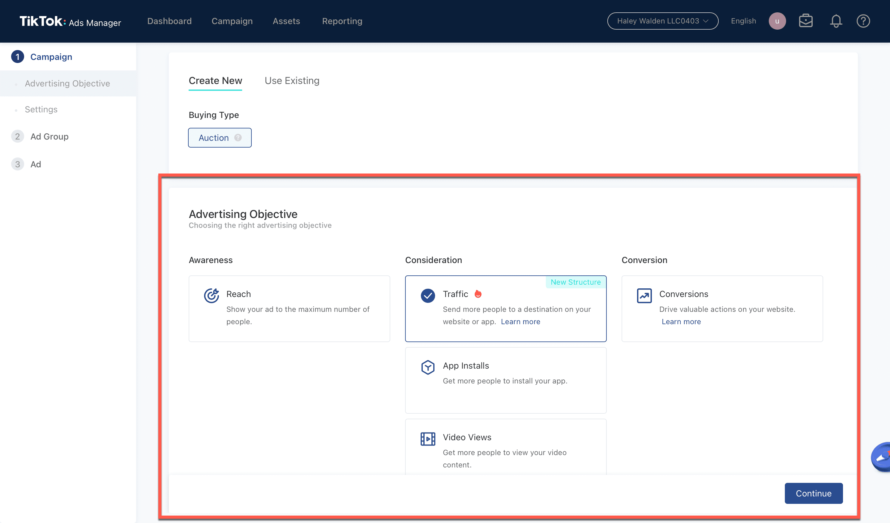 7. Now, it’s time to determine your advertising objectives. Under Create New Campaign, you’ll see that your buying type is Auction. When you put your ads in an auction through TikTok advertising, you can choose a strategy for bidding that will help you to meet the objectives of your campaign. This goal could be efficient budget spend, or controlling the cost per result on your campaign