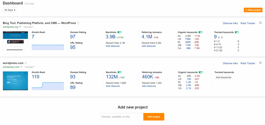 The dashboard shows a screenshot of your website, gives you an Ahrefs rank with a chart for the past 30 days, and shows your domain ranking, URL rating, number of backlinks, referring domains, number of organic keywords by country, and the tracked keywords with your ranking.