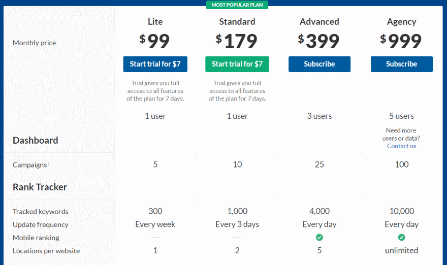 - Lite – $99 per month, 1 user, 5 campaigns