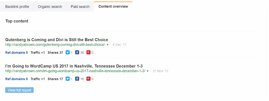 Content overview shows your most popular content and provides the number of referring domains, traffic, and social shares. This is good information to research about your competition.