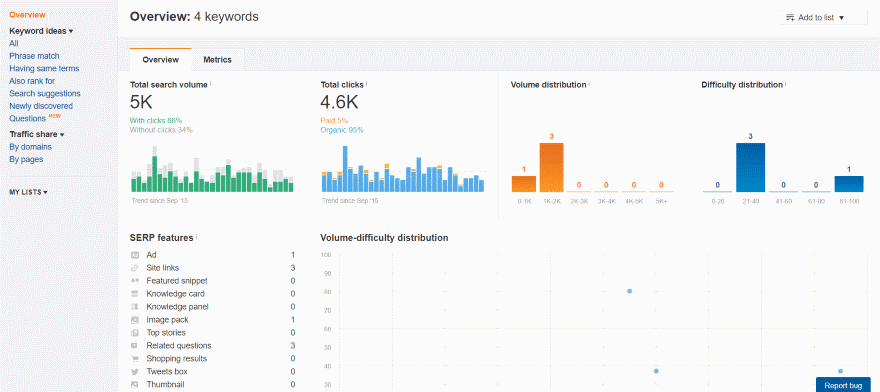 The overview shows the search volume, total clicks, volume distribution, and difficulty distribution. This is the overview for all four keywords. You can also dig deeper into each keyword (which is more valuable).