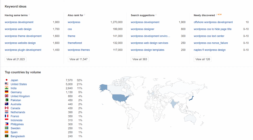Keyword ideas shows keywords that use the same terms, other keywords that the top ranking pages ranked for, suggestions to search for, and newly discovered keywords. You can also see top countries by volume, traffic share by domains, and traffic share by pages. This is one of the most useful tools because I don’t always know what other words to search for and this does it automatically.