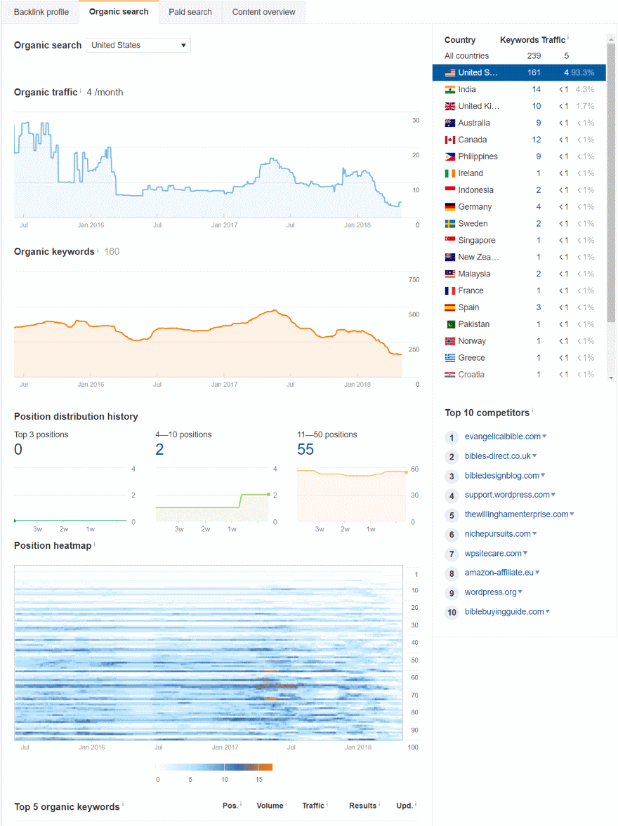 Organic search shows an interesting heatmap with organic keywords. Other charts show your top 5 organic keywords, top 5 pages, etc.