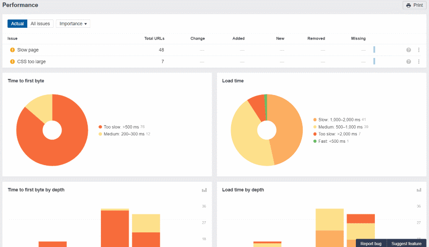 Performance shows the page speed including time to first byte and load time.