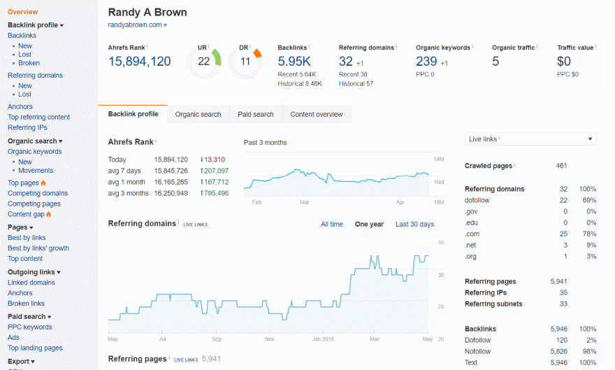 Overview shows you a lot more detail. It shows some of the same info as the previous screen (using different charts), but adds organic traffic and traffic value. Under this is a detailed list of charts which include Backlink profile, Organic search, Paid Search, and Content overview. The sidebar includes links to more detailed charts. This is the Backlink Profile.
