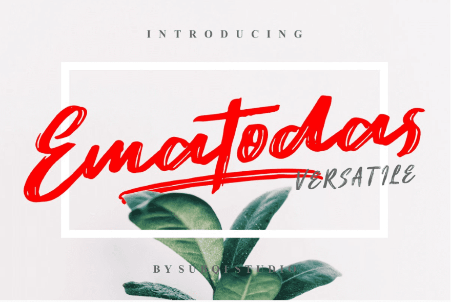 Ematodas is a bold brush handwritten typeface that has a drybrush texture. It includes upper and lower case, numbers, punctuation, symbols, ligatures, and stylistic alternates. It can be used for unlimited personal or commercial projects, and for unlimited sales of end products.