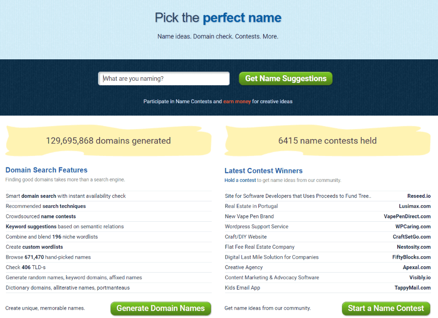 NameStation lets you type in a keyword and select appropriate tags to help provide names that are better focused. It will list available and taken names within tabs. Filters allow you to see names that contain your keywords, alterations, plurals, your selected topics, invented names, and more. The names are given a ranking. You can even hold contests to get ideas from the community.