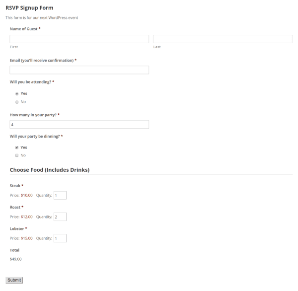 The food choices are product fields. They will only display if the user selects that they will be dining. The Total field uses the number fields above it to calculate a total. I didnβt select the fields for it to use. I only selected to use above inputs and it does the rest. The Total field also uses conditional logic so it will only display if the user is dining.