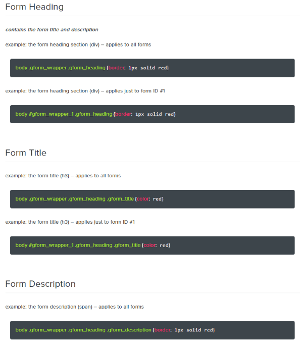 The documentation also includes lots of CSS examples to create styles. Every detail of every field can be styled using these targeting samples. So if you want a different color background within the field, different color for a certain font, or want a field to have a border, you can do that with these examples. Β Simply copy and paste them, and then modify them to suit your needs.