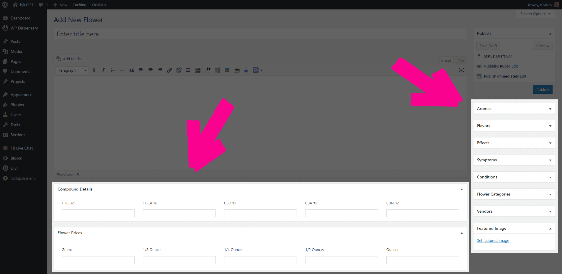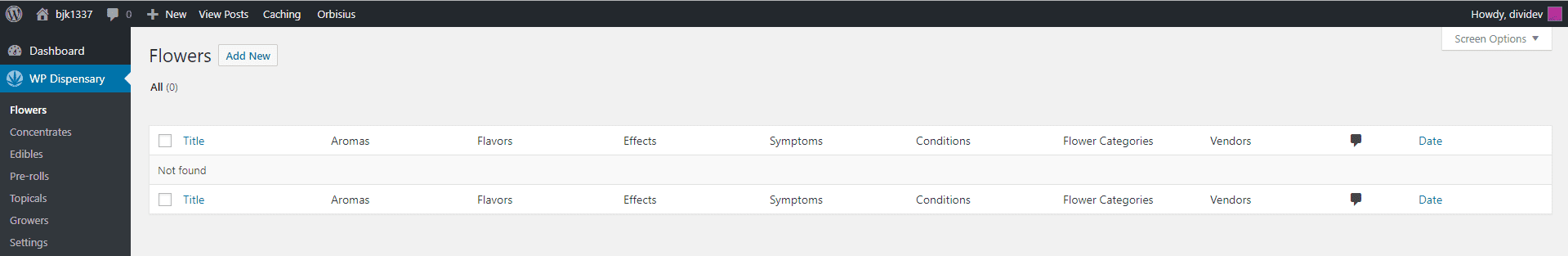 To add a new Flower (or other menu item) to the WP Dispensary menu, click the Add New button when you’re inside the Flowers tab.