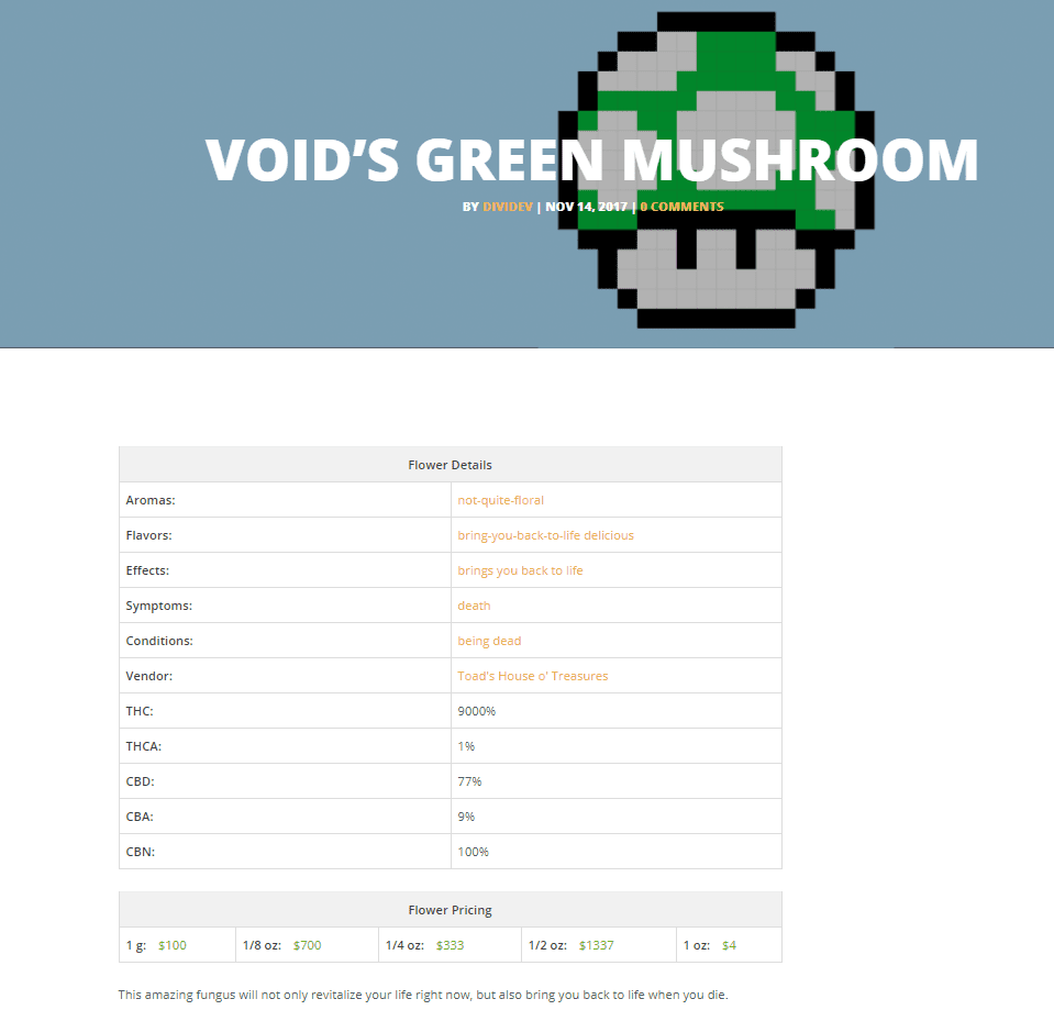 Adding new items, details, and menu items is dead simple. The plugin treats each new flower (or concentrates, etc.) as a new post with special meta-boxes so the editing process should be intimately familiar to you.