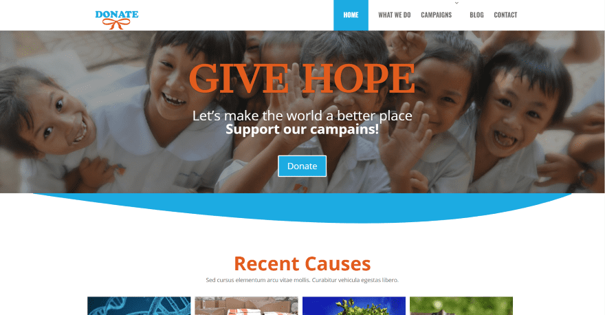 Donate comes with 6 main pages including a campaign page and a cause page. The home page shows a full-width image with a tagline and a donate button. Following this is a section for recent causes, displaying each cause within a donation card. The card shows the image, title, description, amount needed, amount raise, a read more link, and several boxes to choose the amount to donate. The About information is shown within circled blurbs and bar counters are used to show where the donations go. It also includes a number counter, blog posts, and a CTA. The menu includes hover animations. It uses the Give plugin.