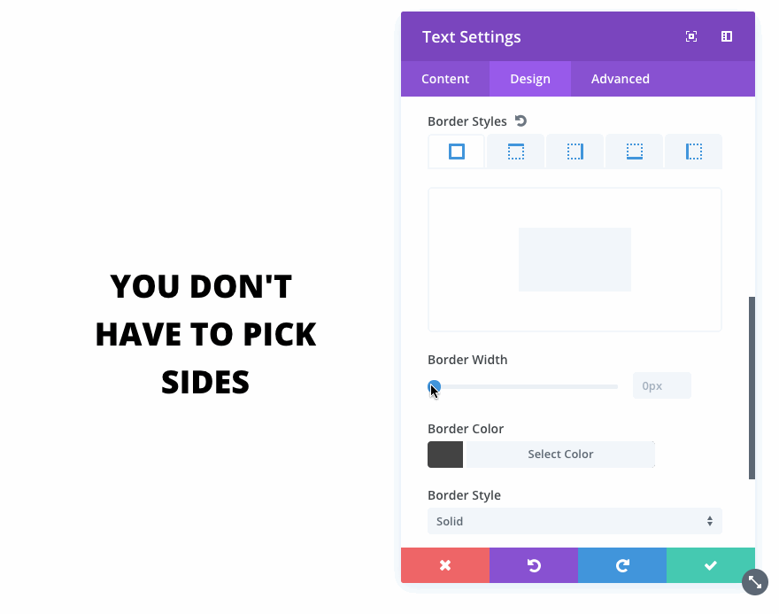 Divi makes it easy to manage border options for all modules, rows and sections using the new border options interface. Within this simple and intuitive UI, you can customize your border color, size and style and adjust each edge individually. If you are working in Wireframe mode, you also get the benefit of a live border style preview within the settings popup!
