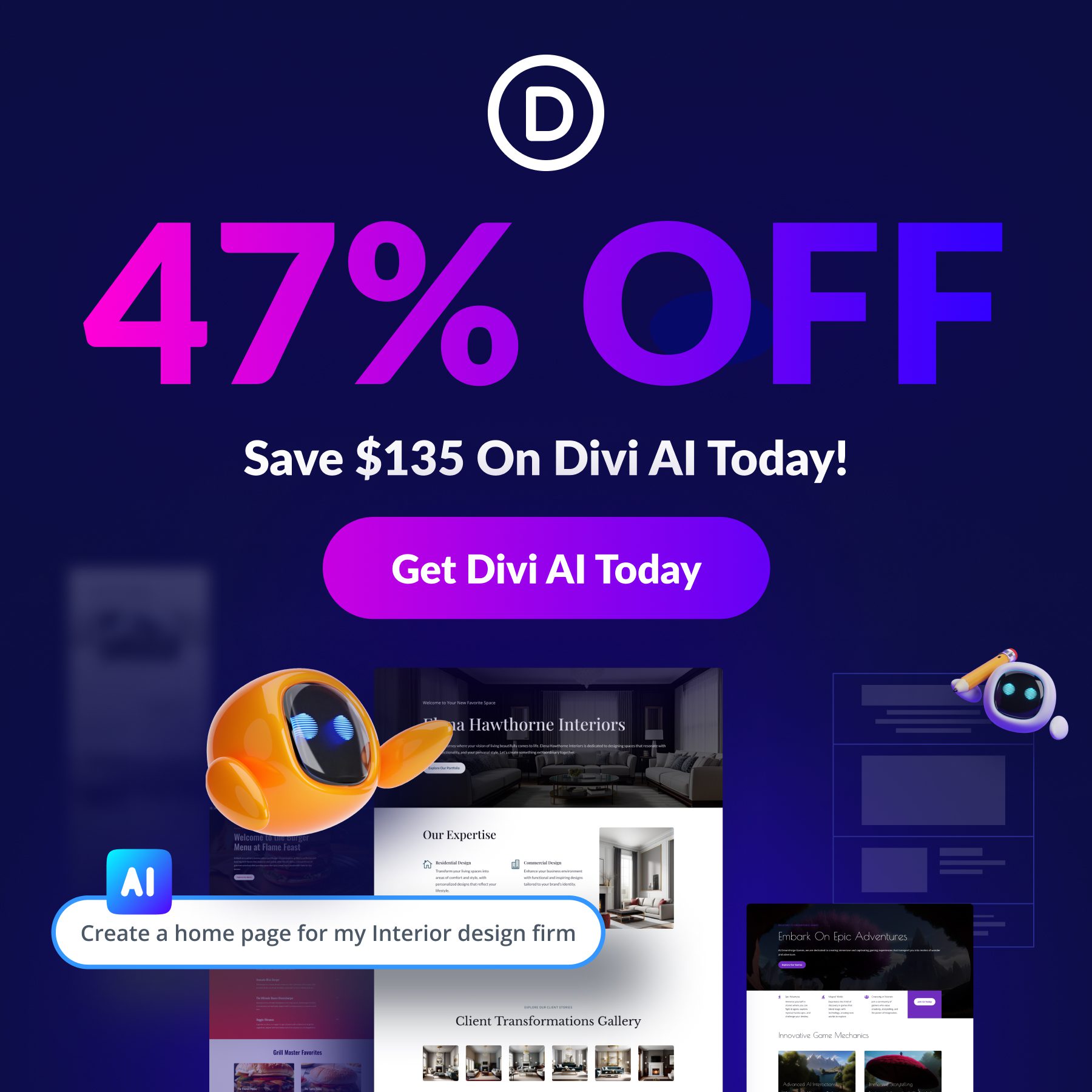 To celebrate the launch of the Divi Layouts AI, we are offering 47% off Divi AI for the next week. Anyone who purchases Divi AI before the sale ends will save $135 per year and lock in those savings for life! Plus, all your team members can use Divi AI at no additional cost. Get the discount here 👇