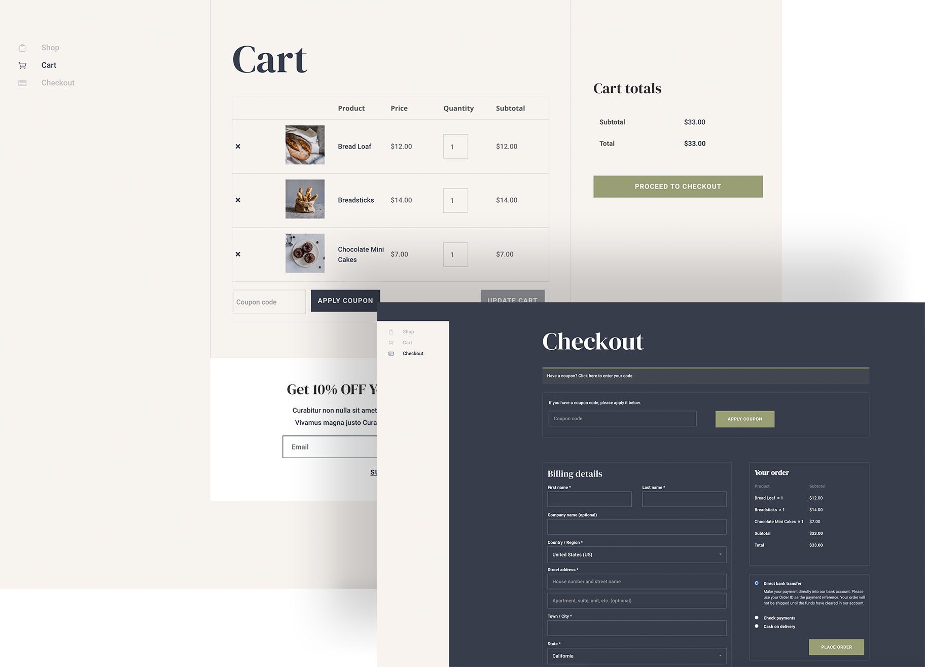 You can fully customize their designs, move them around the page and combine them with other Divi modules to create a completely custom cart and checkout experience. Since these pages are composed of Divi modules, there are no limits to what you can do and each module is filled with a huge array of design options that allow you to customize everything about them.