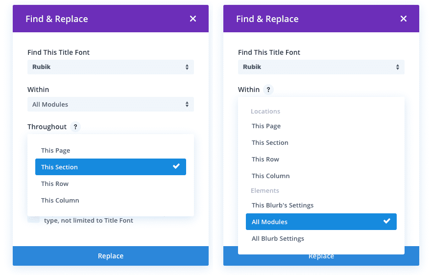 When you find and replace a value, you have full control over the scope and location of the replacement. You can find and replace particular values within particular areas, or you can find and replace values across your entire page. You can limit replacement to particular option types, or you can replace all found values across all modules and all options. The system is incredibly robust.