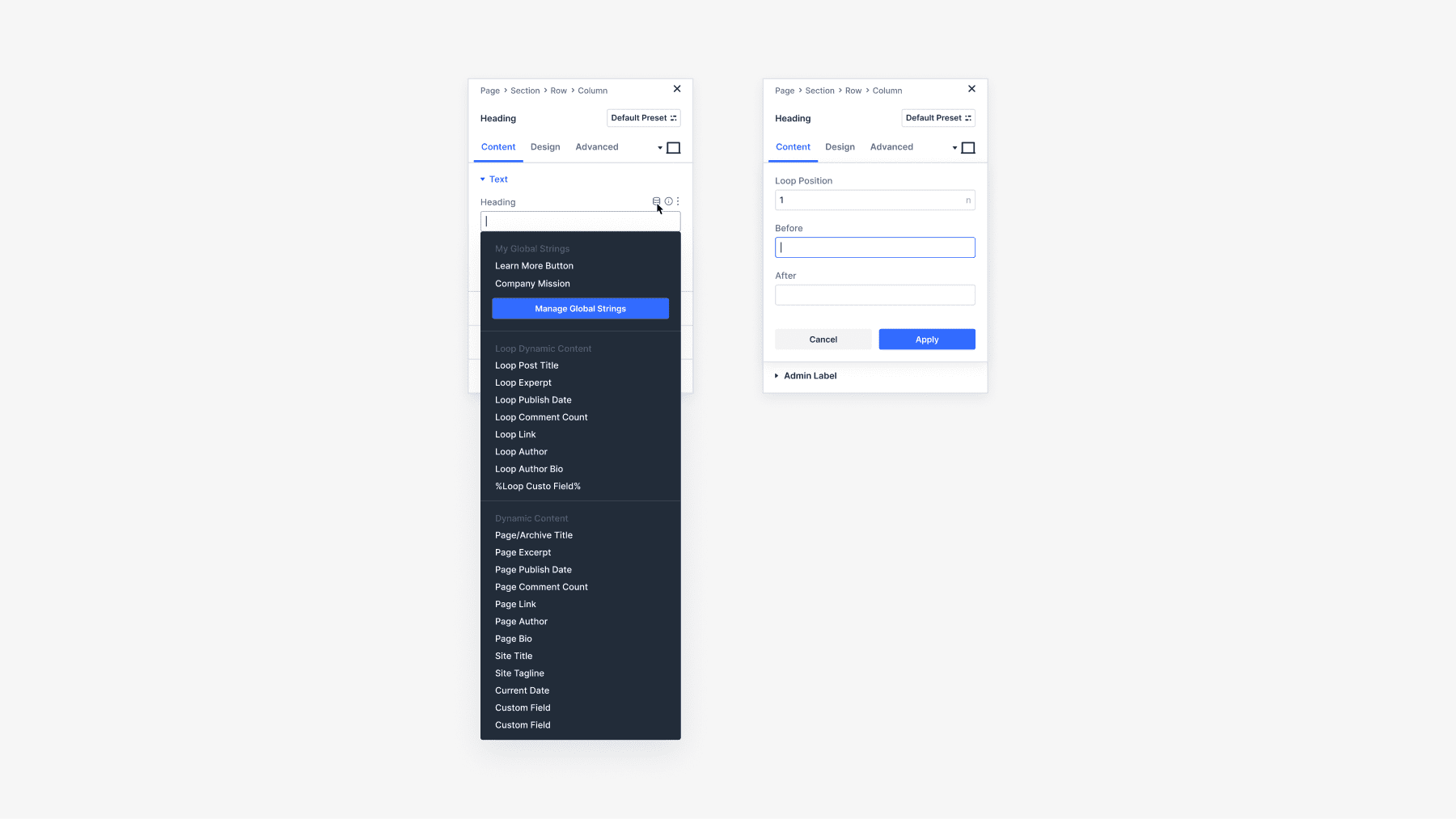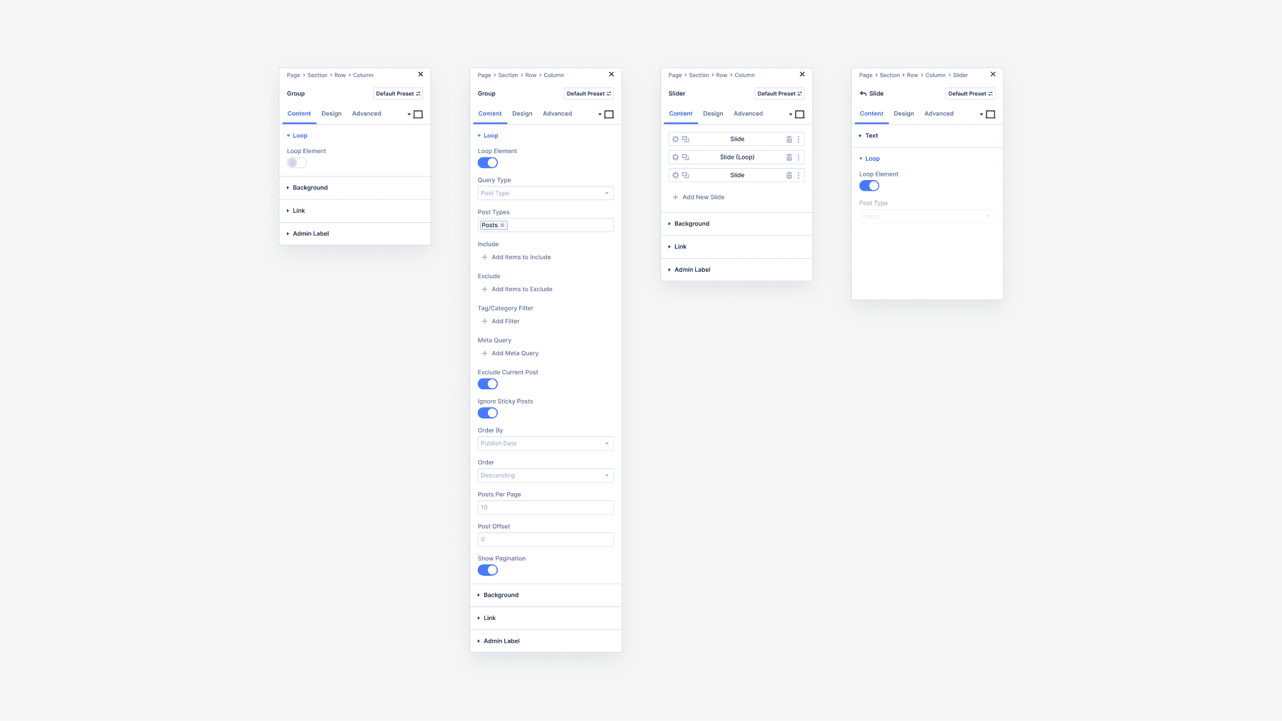 Toggle on the loop option for any element, such as a row or column, and choose which types of posts will fill the loop. You can control what content appears in your loop by adjusting various query options.