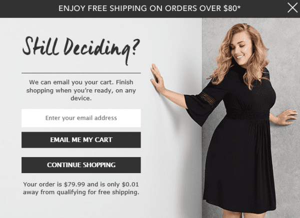 This exit popup from Autograph pulls out all the stops in attempting to entice the shopper to enter their email address. Aside from offering to email the cart contents, it also lets the visitor know they can shop on any device, and that they have almost reached the minimum order value to qualify for free shipping.