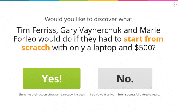 I think one of the things I don’t like about pop-ups is the kind of language you see in the Entrepreneur On Fire example. I don’t like when the “no, thanks” option has some sort of smart-ass comment like, “No, I’m not interested in doing better with my business,” or “No, I don’t want to learn from successful people.” That drives me nuts. The first time seeing something like that can be kind of eye-rolling, but after a while it just gets old because it’s kind of an insult to the person trying to click out with “no, thank you.”