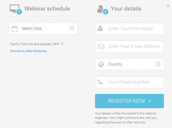 This popup from Neil Patel puts this tactic to use by assuming that the visitor will be attending a webinar and asking them to choose a date and provide registration details.