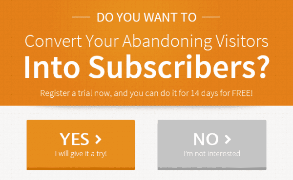 So I think it’s kind of rude and annoying to make the visitor have to click a button whose wording insults them like they’re stupid or foolish or lousy at business or not motivated enough, simply for not choosing to take the offer at that moment. There are nicer *and* funnier wordings to display for the yes and the no answers, without insulting the customer you’re trying to engage and keep.