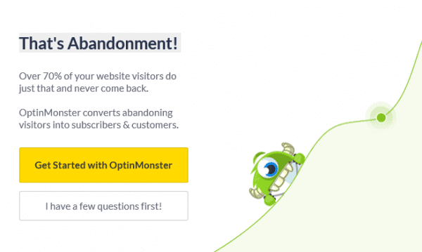 Optin Monster offers a suite of popup options, all highly customizable in terms of both design and behavior. Exit popups can incorporate exit-intent technology to detect user behavior and offer appropriately targeted popups. The image above shows an exit popup from Optin Monster’s website; it uses a few of the tactics we’ll be talking about momentarily.