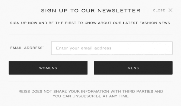 This popup from Reiss subtly asks the visitor for their gender information as part of the newsletter signup. This small piece of information can be used to target email correspondence more effectively and also provides useful website analytics data.