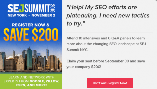 The popup below from Search Engine Journal offers a hefty discount for signing up by a specified date. It reinforces a sense of urgency by using the word “Help!” in the copy, and injects even more urgency into the offer by using insistent wording in the CTA button copy.