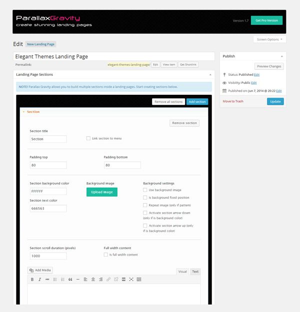 Parallax Gravity is a useful landing page creator that can be used to create beautiful pages. Each page is divided into sections. In each section, you can define a background image or color, font color, padding, and more. Your sales text and subscription forms can then be inserted via the post editor.