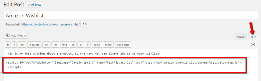 To insert the Amazon add to wish list button in an individual post or page, all you need to do is paste the script into the Text tab of the WordPress Editor like so: